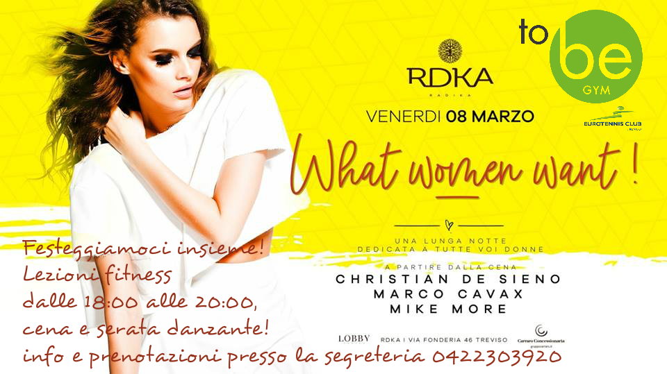 FESTEGGIA CON NOI LA FESTA DELLA DONNA!! Carissima amica, abbiamo riservato per te e per tutte le donne di To Be Gym ed Eurotennis club Treviso una serata speciale per la giornata della Donna! L'8 marzo ci saranno lezioni di 30 minuti di Fitness aperte a tutte coloro che vorranno (anche amiche esterne, non tesserate) dalle ore 18:00 alle ore 20:00. A seguire ci sarà cena (menù pizza) e serata danzante, presso il locale Radika in via Fonderia, 46. La quota di partecipazione va versata in segreteria entro il 5 marzo. |