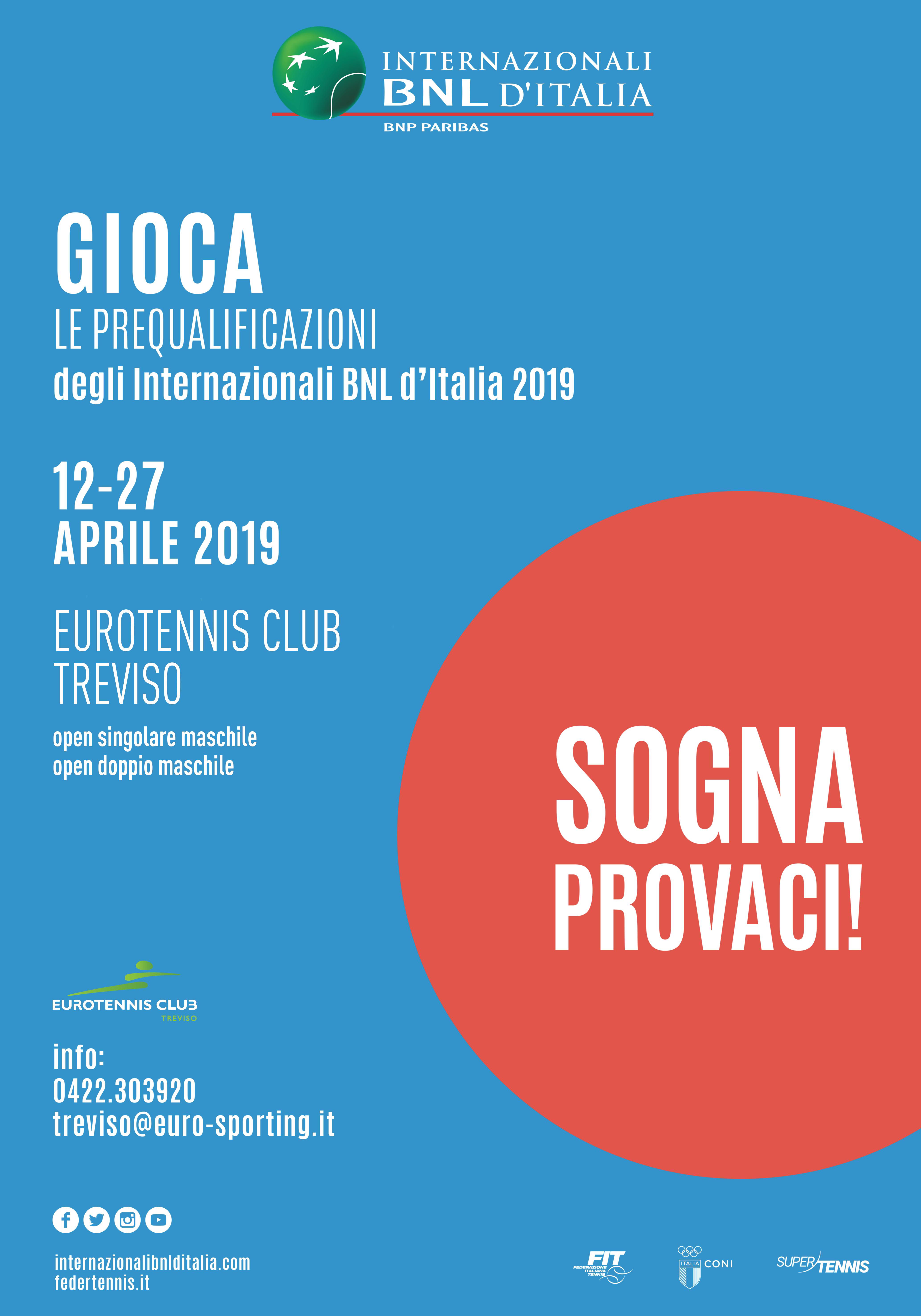 ISCRIVITI ALLA TAPPA DI PREQUALIFICAZIONE AGLI INTERNAZIONALI BNL D'ITALIA Sarà un'edizione da ricordare quella che comincia venerdì 12 aprile all'Eurotennis Club Treviso con la tappa di Prequalificazione agli Internazionali BNL d'Italia. Quest'anno la città trevigiana ospiterà il singolare maschile ( dai 3.5 fino alla 1^ categoria) e il doppio maschile ( dalla 4^ categoria fino alla 1^ categoria ). Iscrivetevi entro il 10 aprile al link che trovate qui sotto!! Vi aspettiamo per due settimane di divertimento!!!